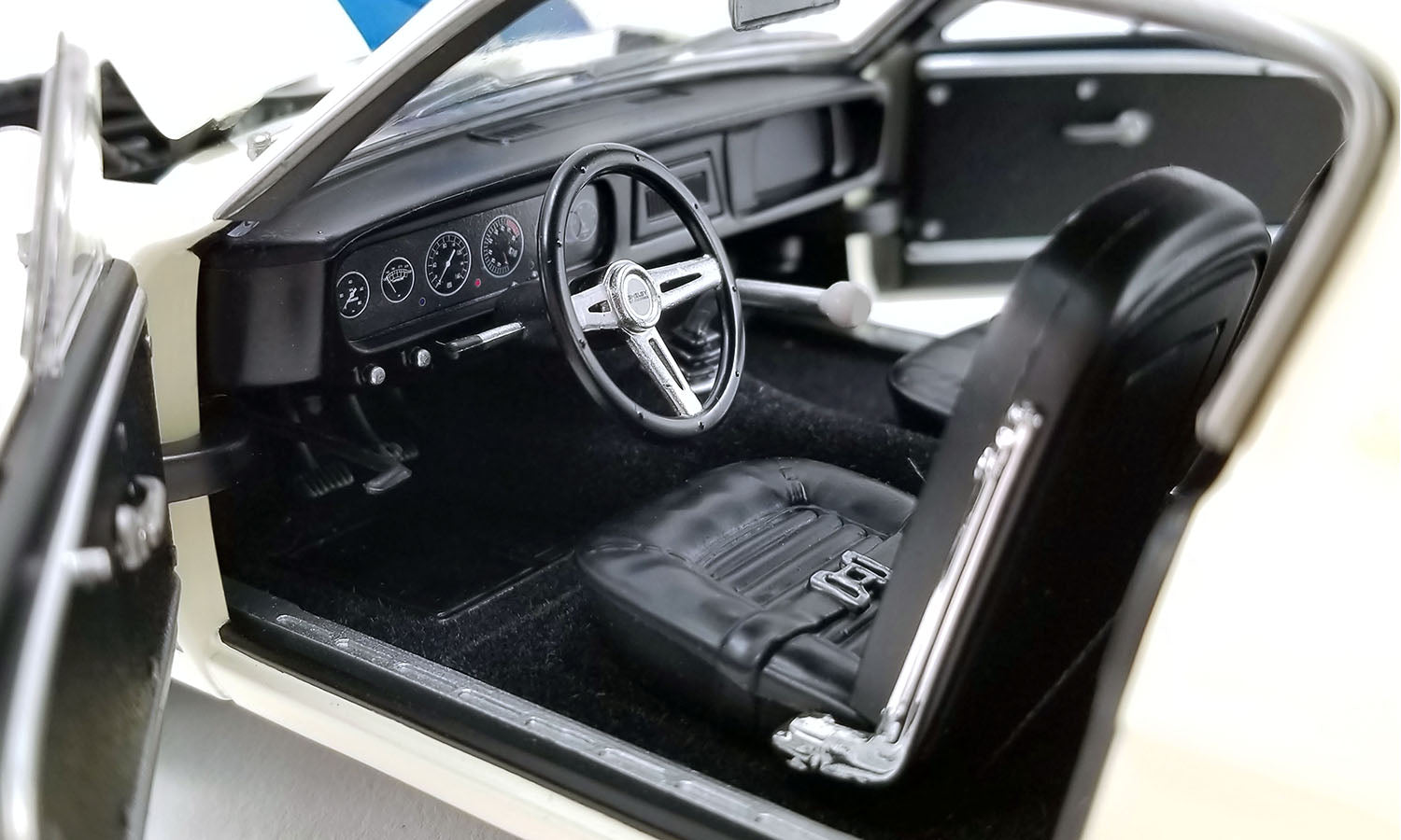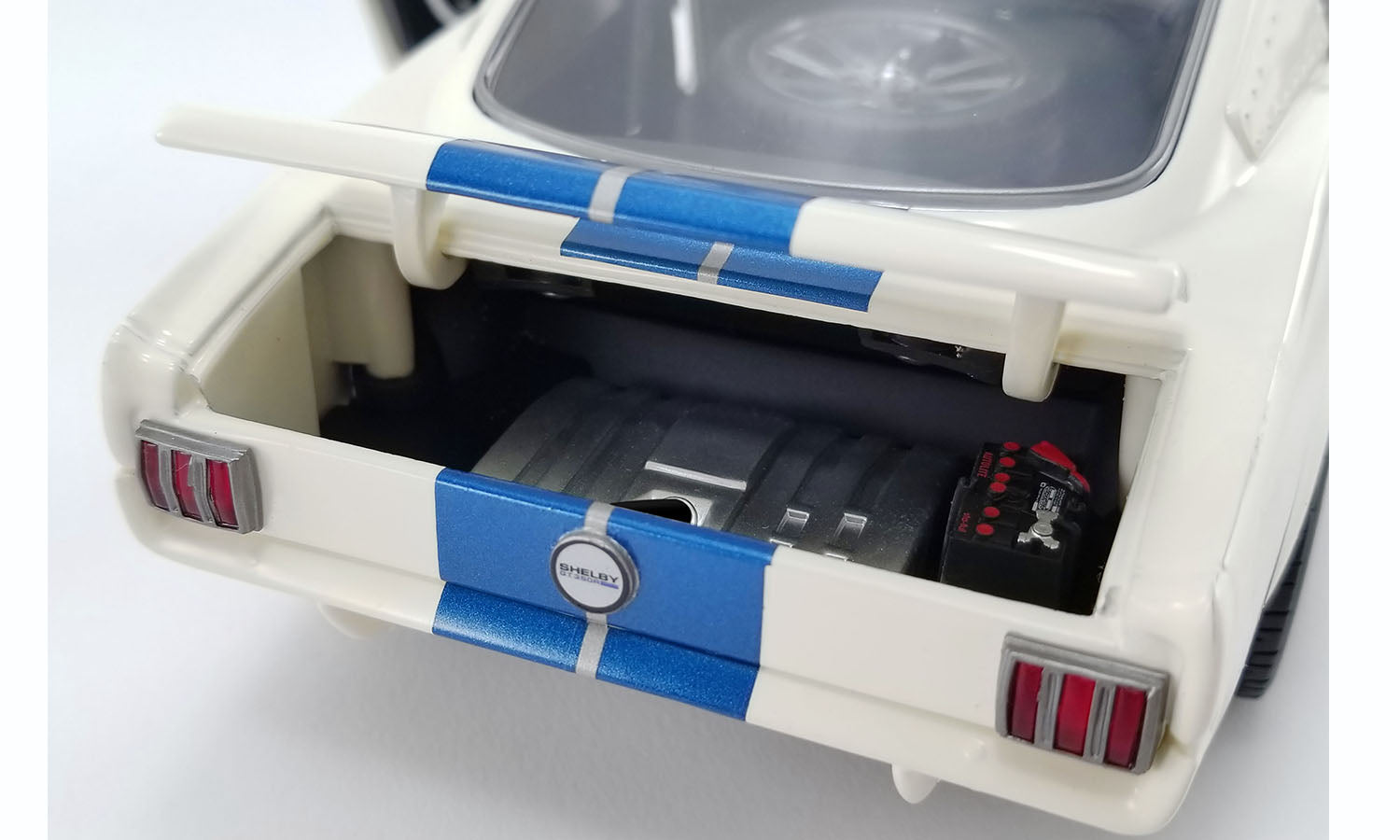 You'll be blown away by this gorgeous muscle car from Acme! This 1965 Ford Mustang Shelby G.T.350R Street Fighter is a 1/18 scale model replica. It comes in cream/ivory and features openable doors, hood and trunk, functional suspension, poseable steering, detailed undercarriage, real rubber tires, serialized plates, plumbed and wired supercharged engine, detailed interior with folding front seat. It's an outstanding model for any muscle car collection, and an awesome find for die-hard Ford aficionados!