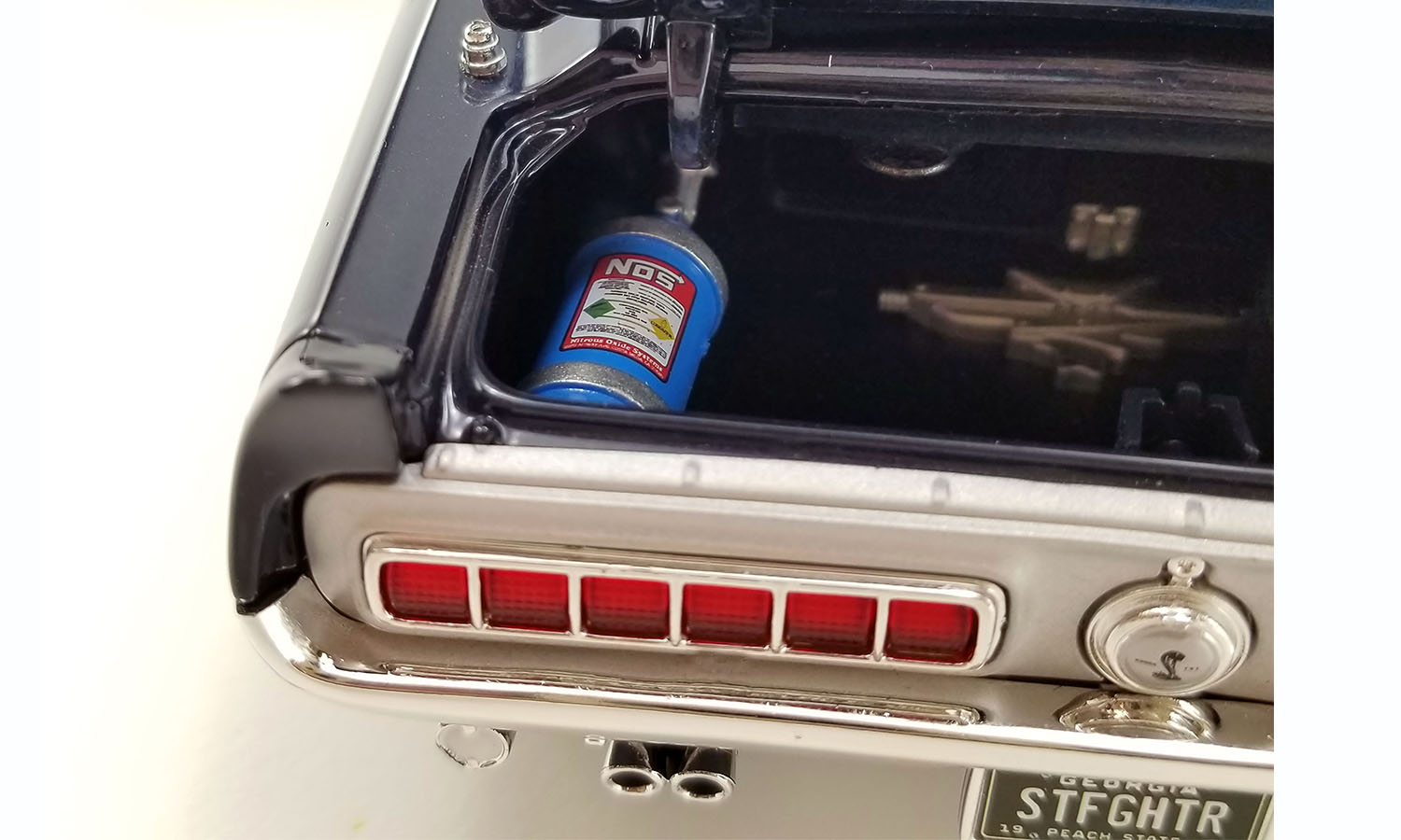 The 1968 Shelby GT500KR diecast model recreates American muscle at its finest. This collector's car features a plumbed and wired 428 engine, detailed interior with tilting front seat and fabric seat belts, street fighter gauges, opening hood and doors, street fighter wheels and tires, and a nitrous bottle hidden in the trunk. This Ford is finished with Shelby Dark Blue Metallic paint and includes a serialized plate.
